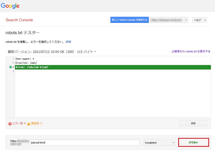 クロールが許可されている(ブロックできていない)場合は、「許可済み」と緑色で表示されます。