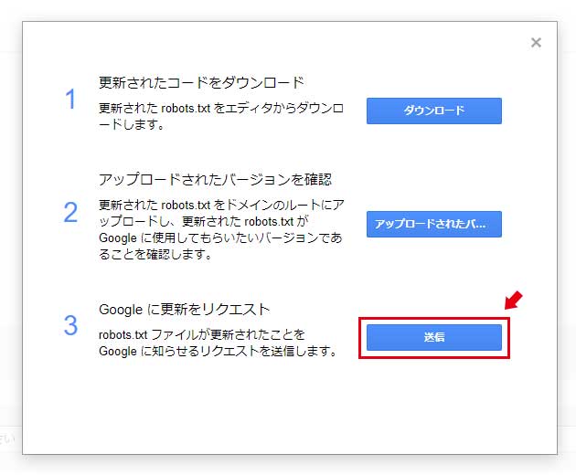 「送信」をクリックすると、下の画像のようなダイアログが表示されるので、3の「Googleに更新をリクエスト」の『送信』をクリックすると、robots.txtが設置・更新されます。