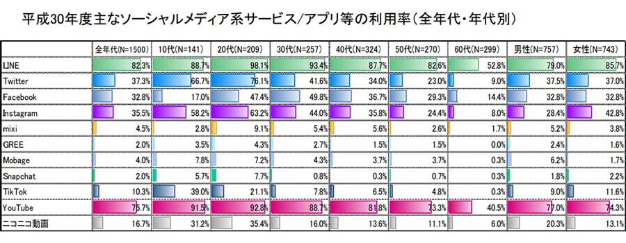 リアルタイムで家族や友人、知人たちとやりとりできるのが、LINEの魅力の1つです。どの年代でも利用率が高く、平成30年には全年代での利用率が80%を突破しています。20代と30代では90%を超えていますし、50代で約82%、そして60代でも約52%の人が利用しています。
