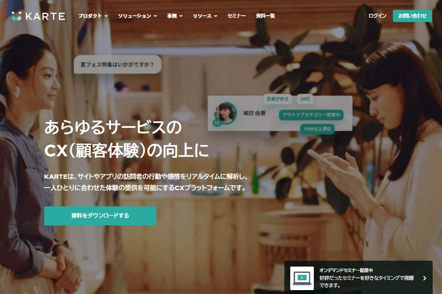 「KARTE」は、ユーザーの行動や感情をリアルタイムで解析し、1人ひとりに合わせたCX(顧客体験)を提供するWeb接客ツールです。