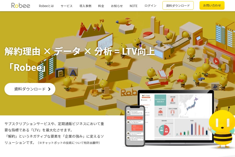 「Robee」は、既存ユーザーの解約理由から企業課題を発見・解決することで、解約防止やコンバージョン率向上を目指すWeb接客ツールです。「解約防止」と「Web接客」という2種類のサービスが用意されており、既存顧客の維持と新規顧客の獲得に向けた施策を同時に進められます。