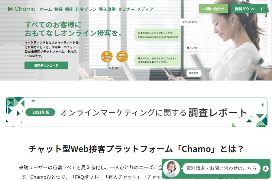 「Chamo」は、マーケティング&カスタマーサポートの強化を同時に叶えるチャット型のWeb接客プラットフォームです。