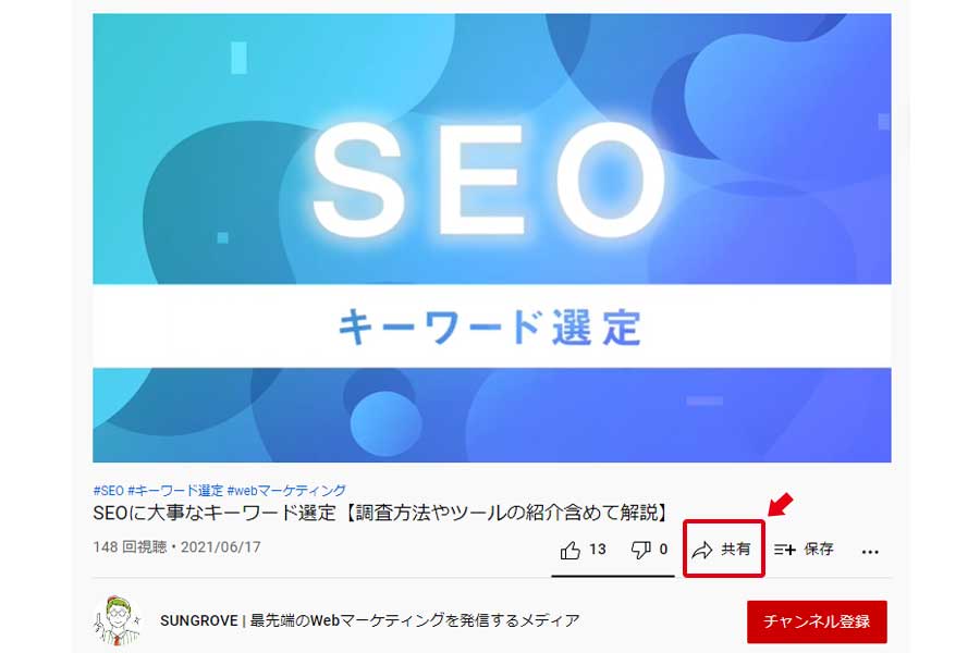 1、埋め込みたいYouTube動画のページにある『共有』をクリック