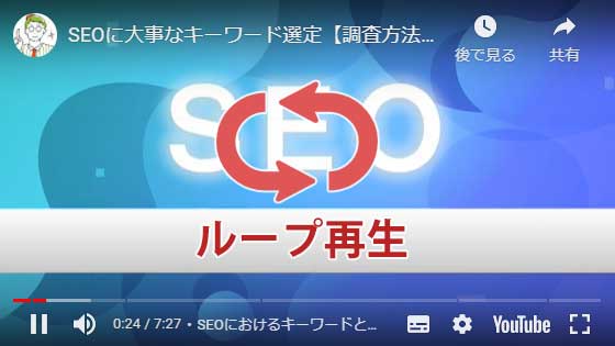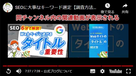 関連動画を表示させたくない場合は、動画をループさせるようにすることで、関連動画を出さないようにしましょう。
